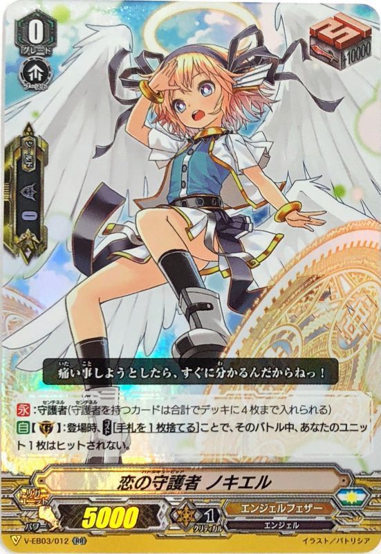 【永】:守護者(守護者を持つカードは合計でデッキに4枚まで入れられる)【自】【(G)】:登場時、【コスト】[手札を1枚捨てる]ことで、そのバトル中、あなたのユニット1枚はヒットされない。