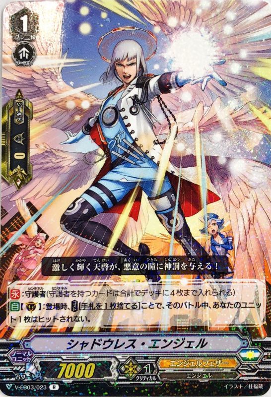 【永】:守護者(守護者を持つカードは合計でデッキに4枚まで入れられる)【自】【(G)】:登場時、【コスト】[手札を1枚捨てる]ことで、そのバトル中、あなたのユニット1枚はヒットされない。