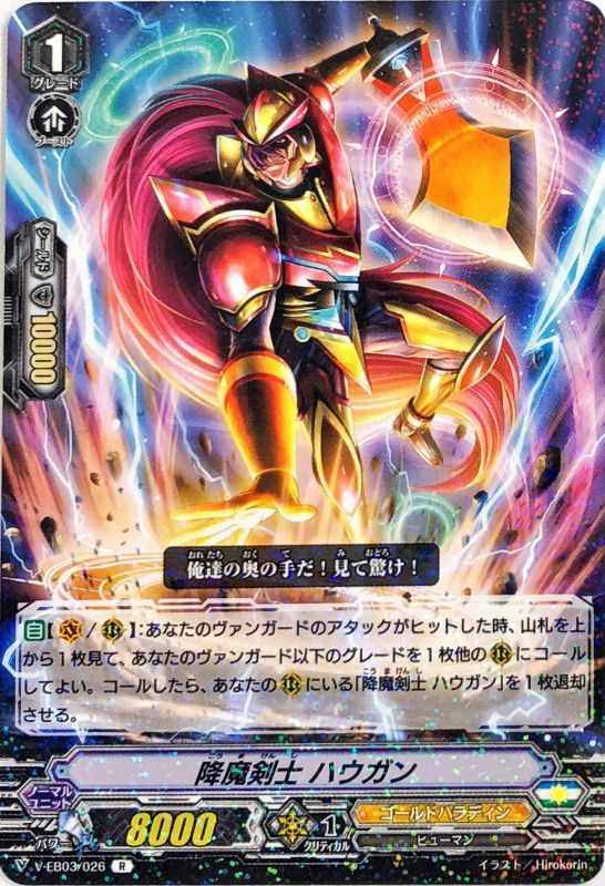 【自】【(V)/(R)】:あなたのヴァンガードのアタックがヒットした時、山札を上から1枚見て、あなたのヴァンガード以下のグレードを1枚他の(R)にコールしてよい。コールしたら、あなたの(R)にいる「降魔剣士 ハウガン」を1枚退却させる。