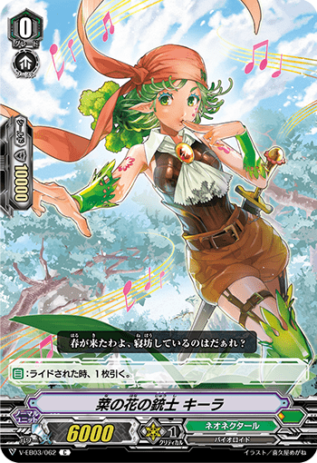 【自】:ライドされた時、1枚引く。さらに、相手のヴァンガードがグレード1以上なら、あなたはクイックシールド・チケットを1枚手札に加える。