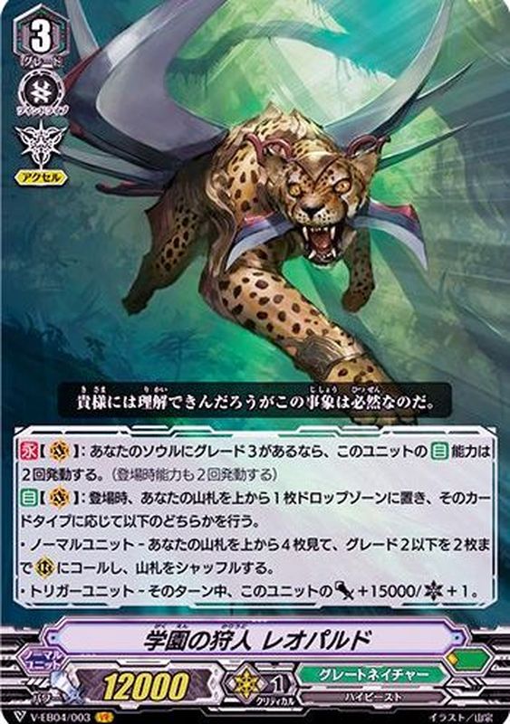 【永】【(V)】:あなたのソウルにグレード3があるなら、このユニットの【自】能力は2回発動する。(登場時能力も2回発動する)【自】【(V)】:登場時、あなたの山札を上から1枚ドロップゾーンに置き、そのカードタイプに応じて以下のどちらかを行う。・ノーマルユニット-あなたの山札を上から4枚見て、グレード2以下を2枚まで(R)にコールし、山札をシャッフルする。・トリガーユニット-そのターン中、このユニットのパワー+15000/クリティカル+1。