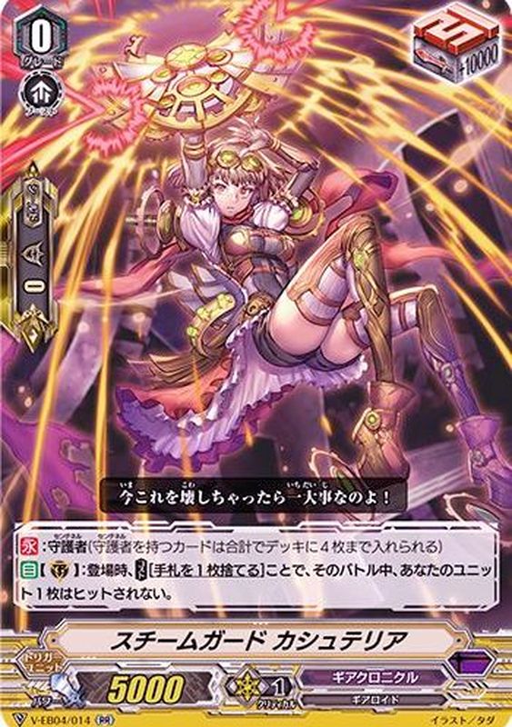 【永】:守護者(守護者を持つカードは合計でデッキに4枚まで入れられる)【自】【(G)】:登場時、【コスト】[手札を1枚捨てる]ことで、そのバトル中、あなたのユニット1枚はヒットされない。