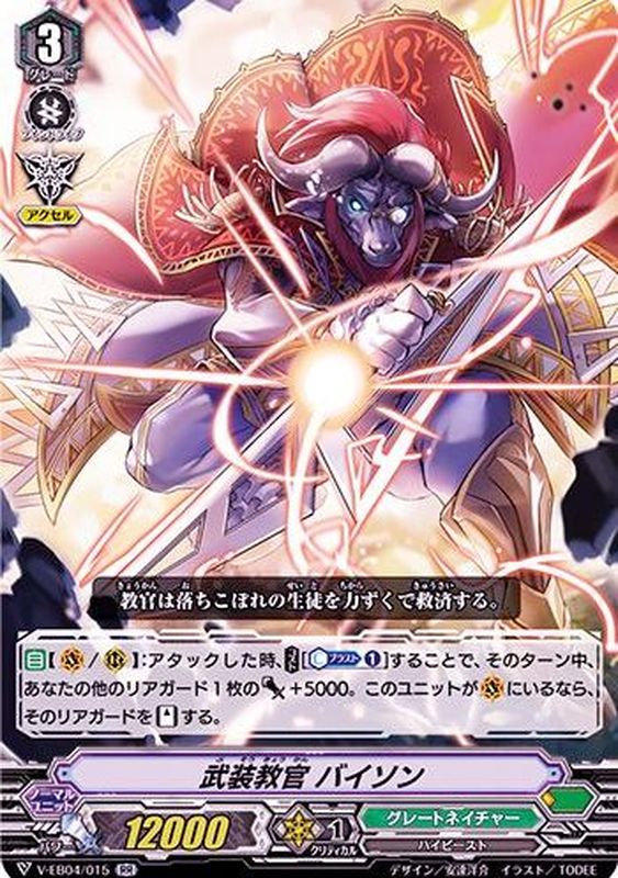 【自】【(V)/(R)】:アタックした時、【コスト】[【カウンターブラスト】(1)]することで、そのターン中、あなたの他のリアガード1枚のパワー+5000。このユニットが(V)にいるなら、そのリアガードを【スタンド】する。