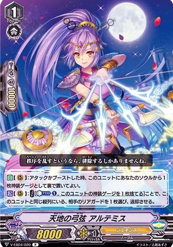 【自】【(R)】:アタックかブーストした時、このユニットにあなたのソウルから1枚神装ゲージとして裏で置いてよい。【起】【(R)】:【コスト】[【カウンターブラスト】(1),このユニットの神装ゲージを1枚捨てる]ことで、このユニットと同じ縦列にいる、相手のリアガードを1枚選び、退却させる。