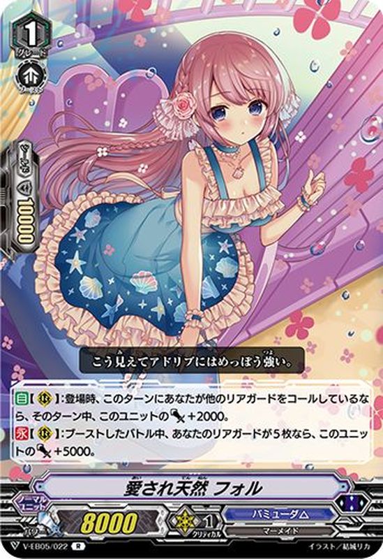 【自】【(R)】:登場時、このターンにあなたが他のリアガードをコールしているなら、そのターン中、このユニットのパワー+2000。【永】【(R)】:ブーストしたバトル中、あなたのリアガードが5枚なら、このユニットのパワー+5000。