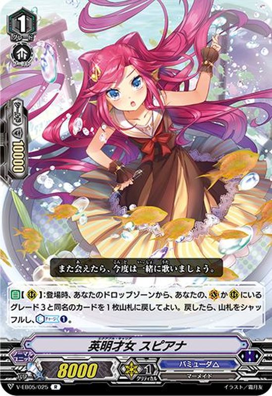 【自】【(R)】:登場時、あなたのドロップゾーンから、あなたの、(V)か(R)にいるグレード3と同名のカードを1枚山札に戻してよい。戻したら、山札をシャッフルし、【カウンターチャージ】(1)。