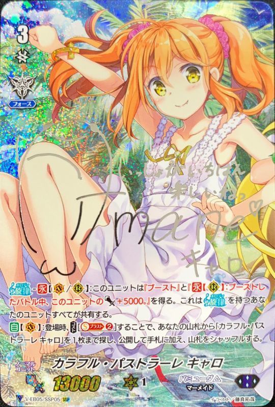 【旋律】-【永】【(V)/(R)】:このユニットは『ブースト』と『【永】【(R)】:ブーストしたバトル中、このユニットのパワー+5000。』を得る。これは【旋律】を持つあなたのユニットすべてが共有する。【自】【(V)】:登場時、【コスト】[【ソウルブラスト】(2)]することで、あなたの山札から「カラフル・パストラーレ キャロ」を1枚まで探し、公開して手札に加え、山札をシャッフルする。