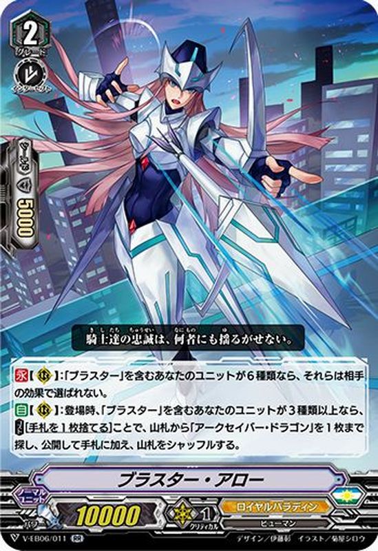【永】【(R)】:「ブラスター」を含むあなたのユニットが6種類なら、それらは相手の効果で選ばれない。【自】【(R)】:登場時、「ブラスター」を含むあなたのユニットが3種類以上なら、【コスト】[手札を1枚捨てる]ことで、山札から「アークセイバー・ドラゴン」を1枚まで探し、公開して手札に加え、山札をシャッフルする。
