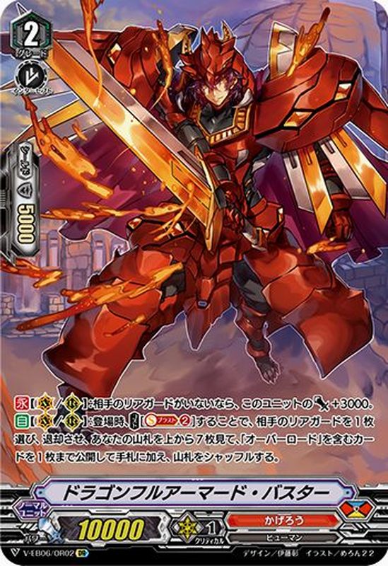 【永】【(V)/(R)】:相手のリアガードがいないなら、このユニットのパワー+3000。【自】【(V)/(R)】:登場時、【コスト】[【ソウルブラスト】(2)]することで、相手のリアガードを1枚選び、退却させ、あなたの山札を上から7枚見て、「オーバーロード」を含むカードを1枚まで公開して手札に加え、山札をシャッフルする。