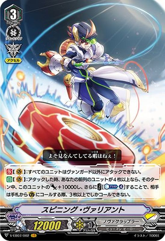 【永】【(V)】:すべてのユニットはヴァンガード以外にアタックできない。【自】【(V)】:アタックした時、あなたの前列のユニットが4枚以上なら、そのターン中、このユニットのパワー+10000し、さらに【コスト】[【カウンターブラスト】(4)]することで、相手は手札から(G)にコールする際、3枚以上でしかコールできない。