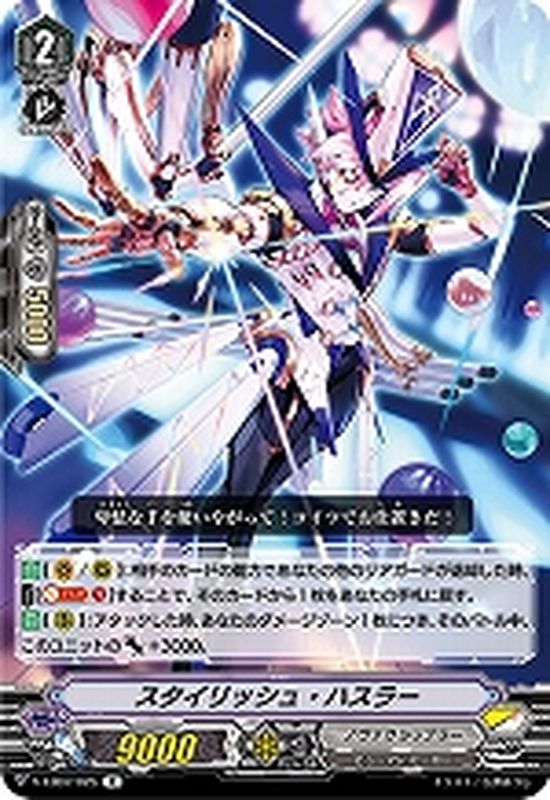 【自】【(V)/(R)】:相手のカードの能力であなたの他のリアガードが退却した時、【コスト】[【ソウルブラスト】(1)]することで、そのカードから1枚をあなたの手札に戻す。【自】【(R)】:アタックした時、あなたのダメージゾーン1枚につき、そのバトル中、このユニットのパワー+3000。