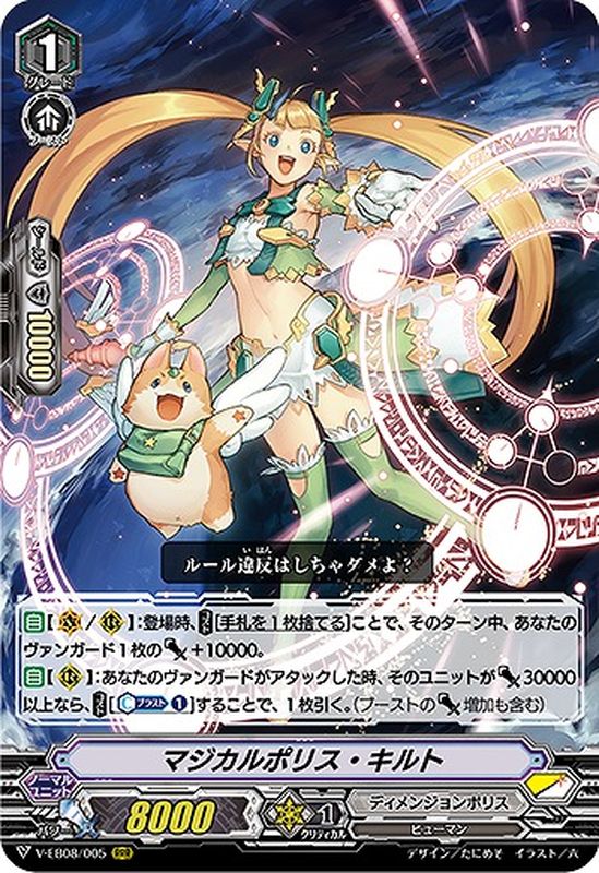 【自】【(V)/(R)】:登場時、【コスト】[手札を1枚捨てる]ことで、そのターン中、あなたのヴァンガード1枚のパワー+10000。【自】【(R)】:あなたのヴァンガードがアタックした時、そのユニットがパワー30000以上なら、【コスト】[【カウンターブラスト】(1)]することで、1枚引く。(ブーストのパワー増加も含む)