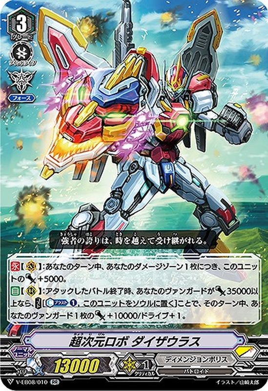 【永】【(V)】:あなたのターン中、あなたのダメージゾーン1枚につき、このユニットのパワー+5000。【自】【(R)】:アタックしたバトル終了時、あなたのヴァンガードがパワー35000以上なら、【コスト】[【カウンターブラスト】(1),このユニットをソウルに置く]ことで、そのターン中、あなたのヴァンガード1枚のパワー+10000/ドライブ+1。