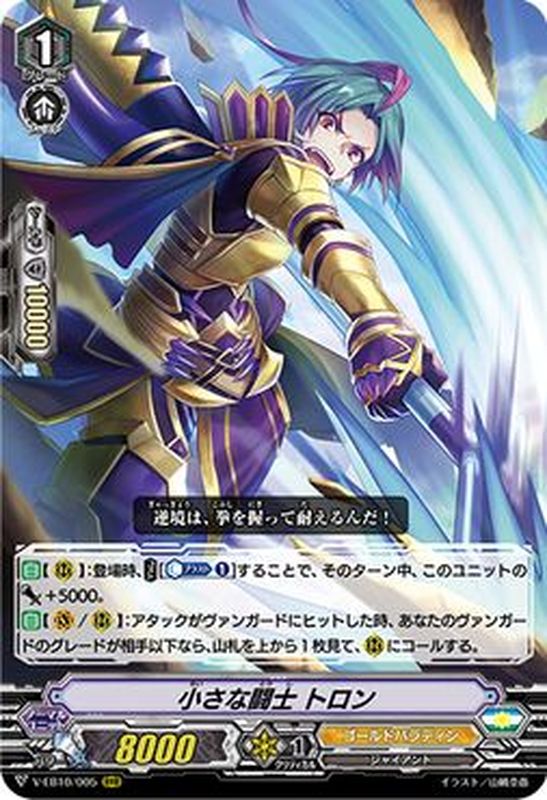 【自】【(R)】:登場時、【コスト】[【カウンターブラスト】(1)]することで、そのターン中、このユニットのパワー+5000。【自】【(V)/(R)】:アタックがヴァンガードにヒットした時、あなたのヴァンガードのグレードが相手以下なら、山札を上から1枚見て、(R)にコールする。