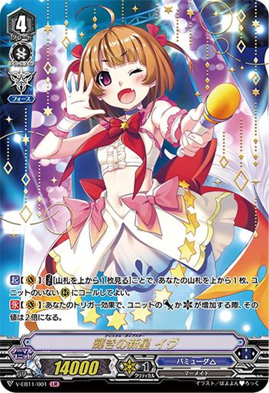 【起】【(V)】:【コスト】[山札を上から1枚見る]ことで、あなたの山札を上から1枚、ユニットのいない(R)にコールしてよい。【永】【(V)】:あなたのトリガー効果で、ユニットのパワーかクリティカルが増加する際、その値は2倍になる。