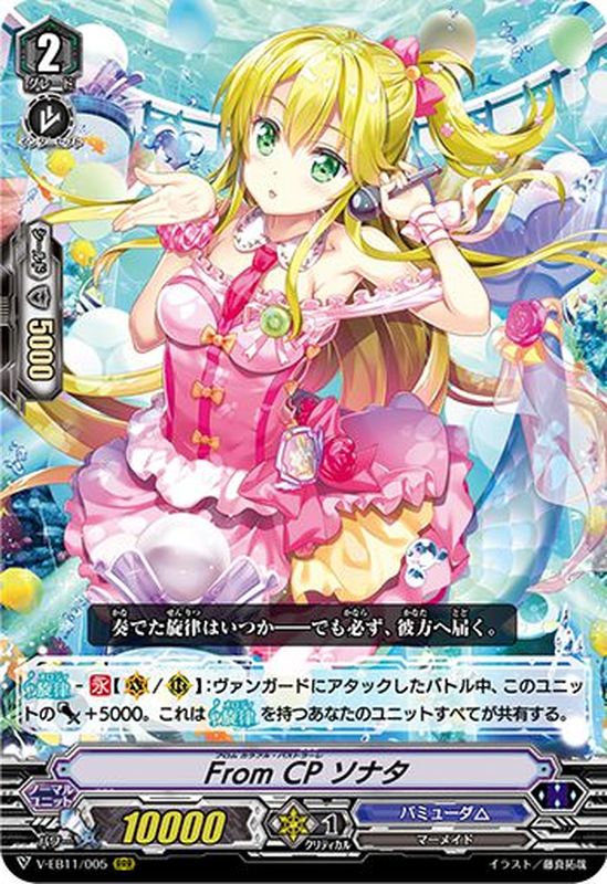 【旋律】-【永】【(V)/(R)】:ヴァンガードにアタックしたバトル中、このユニットのパワー+5000。これは【旋律】を持つあなたのユニットすべてが共有する。