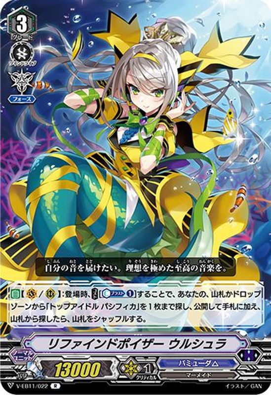 【自】【(V)/(R)】:登場時、【コスト】[【カウンターブラスト】(1)]することで、あなたの、山札かドロップゾーンから「トップアイドル パシフィカ」を1枚まで探し、公開して手札に加え、山札から探したら、山札をシャッフルする。