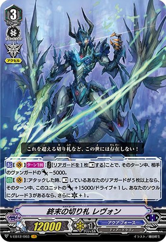 【起】【(V)】【ターン1回】:【コスト】[リアガードを1枚【レスト】する]ことで、そのターン中、相手のヴァンガードのパワー-5000。【自】【(V)】:アタックした時、【レスト】しているあなたのリアガードが5枚以上なら、そのターン中、このユニットのパワー+15000/ドライブ+1し、あなたのソウルにグレード3があるなら、さらにクリティカル+1。