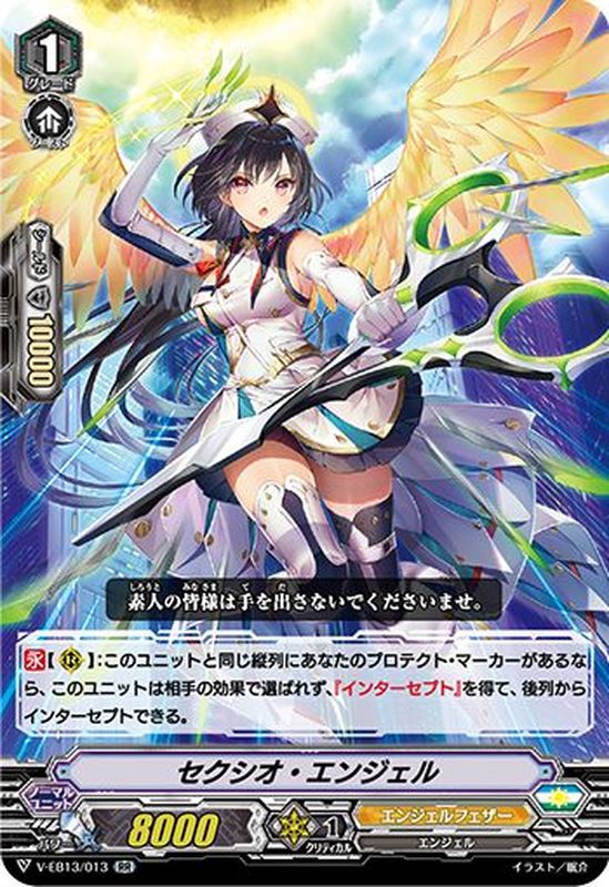 【永】【(R)】:このユニットと同じ縦列にあなたのプロテクト・マーカーがあるなら、このユニットは相手の効果で選ばれず、『インターセプト』を得て、後列からインターセプトできる。