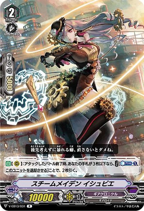 【自】【(R)】:アタックしたバトル終了時、あなたの手札が3枚以下なら、【コスト】[【カウンターブラスト】(1),このユニットを退却させる]ことで、2枚引く。