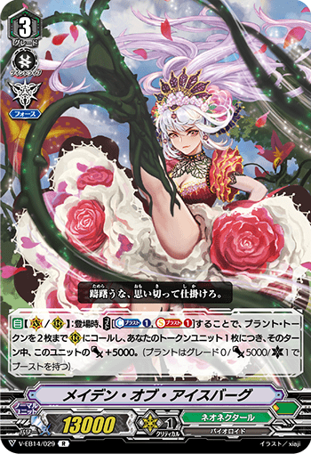 【自】【(V)/(R)】:登場時、【コスト】[【カウンターブラスト】(1),【ソウルブラスト】(1)]することで、プラント・トークンを2枚まで(R)にコールし、あなたのトークンユニット1枚につき、そのターン中、このユニットのパワー+5000。(プラントはグレード0/パワー5000/クリティカル1でブーストを持つ)