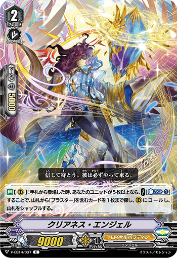 【自】【(R)】:手札から登場した時、あなたのユニットが5枚以上なら、【コスト】[【カウンターブラスト】(1)]することで、山札から「ブラスター」を含むカードを1枚まで探し、(R)にコールし、山札をシャッフルする。