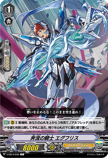 【自】【(R)】:登場時、あなたの山札を上から3枚見て、「アルフレッド」を含むカードを望む枚数公開して手札に加え、残りを山札の下に望む順で置く。