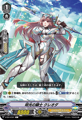 【自】【(R)】:登場時、あなたのユニットが5枚以上なら、【コスト】[【カウンターブラスト】(1)]することで、1枚引く。