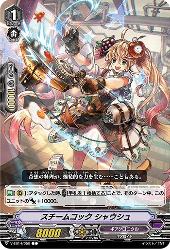 【自】【(R)】:アタックした時、【コスト】[手札を1枚捨てる]ことで、そのターン中、このユニットのパワー+10000。