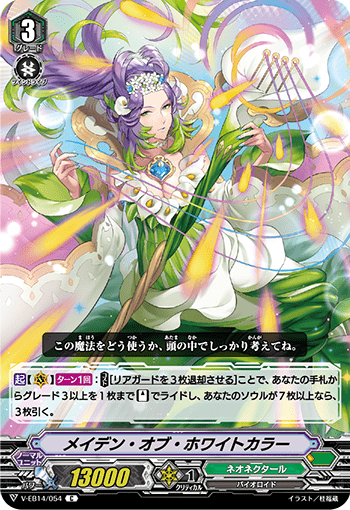 【起】【(V)】【ターン1回】:【コスト】[リアガードを3枚退却させる]ことで、あなたの手札からグレード3以上を1枚まで【スタンド】でライドし、あなたのソウルが7枚以上なら、3枚引く。