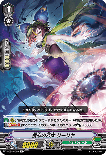 【自】【(R)】:あなたの他のリアガードがあなたのカードの能力で登場した時、【コスト】[【ソウルブラスト】(1)]することで、そのターン中、そのユニットのパワー+5000。