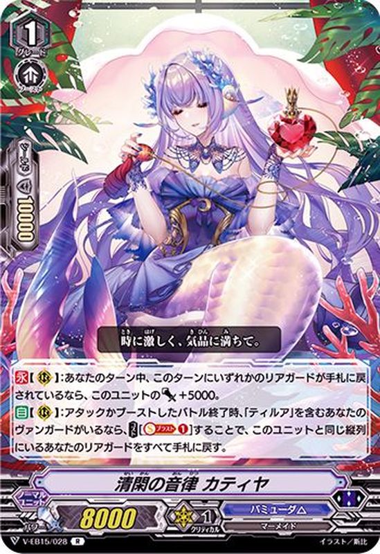 【永】【(R)】:あなたのターン中、このターンにいずれかのリアガードが手札に戻されているなら、このユニットのパワー+5000。【自】【(R)】:アタックかブーストしたバトル終了時、「ティルア」を含むあなたのヴァンガードがいるなら、【コスト】[【ソウルブラスト】(1)]することで、このユニットと同じ縦列にいるあなたのリアガードをすべて手札に戻す。