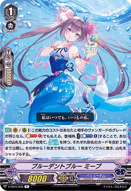 【自】【(V)/(R)】:この能力のコストはあなたと相手のヴァンガードのグレードが同じなら、『【ソウルブラスト】(1)』でも払える。登場時、【コスト】[【カウンターブラスト】(1)]することで、あなたの山札を上から7枚見て、【旋律】を持つ、それぞれ別名のカードを合計2枚まで公開し、その中から1枚まで手札に加え、1枚までソウルに置き、山札をシャッフルする。