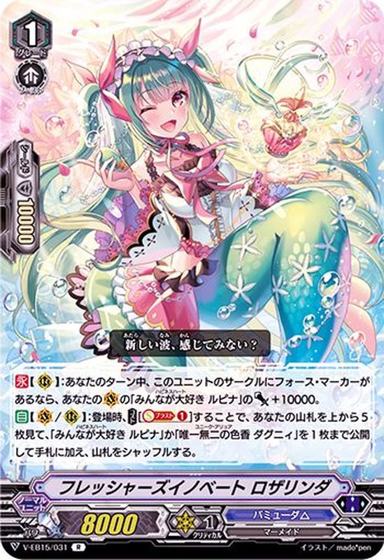 【永】【(R)】:あなたのターン中、このユニットのサークルにフォース・マーカーがあるなら、あなたの(V)の「みんなが大好き ルピナ」のパワー+10000。【自】【(V)/(R)】:登場時、【コスト】[【ソウルブラスト】(1)]することで、あなたの山札を上から5枚見て、「みんなが大好き ルピナ」か「唯一無二の色香 ダグニィ」を1枚まで公開して手札に加え、山札をシャッフルする。