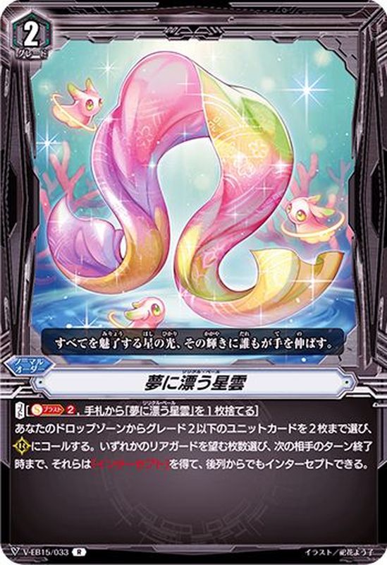 【コスト】[【ソウルブラスト】(2),手札から「夢に漂う星雲」を1枚捨てる]あなたのドロップゾーンからグレード2以下のユニットカードを2枚まで選び、(R)にコールする。いずれかのリアガードを望む枚数選び、次の相手のターン終了時まで、それらは『インターセプト』を得て、後列からでもインターセプトできる。