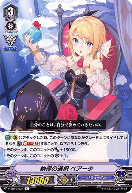 【自】【(R)】:アタックした時、このターンにあなたがグレード4にライドしているなら、【コスト】[【ソウルブラスト】(1)]することで、以下から1つ行う。・そのターン中、このユニットのパワー+15000。・そのターン中、このユニットのクリティカル+1。