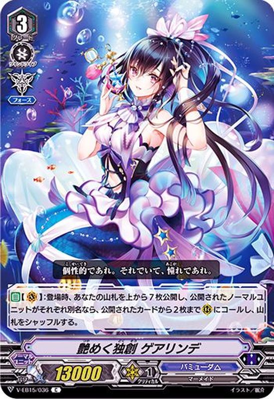 【自】【(V)】:登場時、あなたの山札を上から7枚公開し、公開されたノーマルユニットがそれぞれ別名なら、公開されたカードから2枚まで(R)にコールし、山札をシャッフルする。