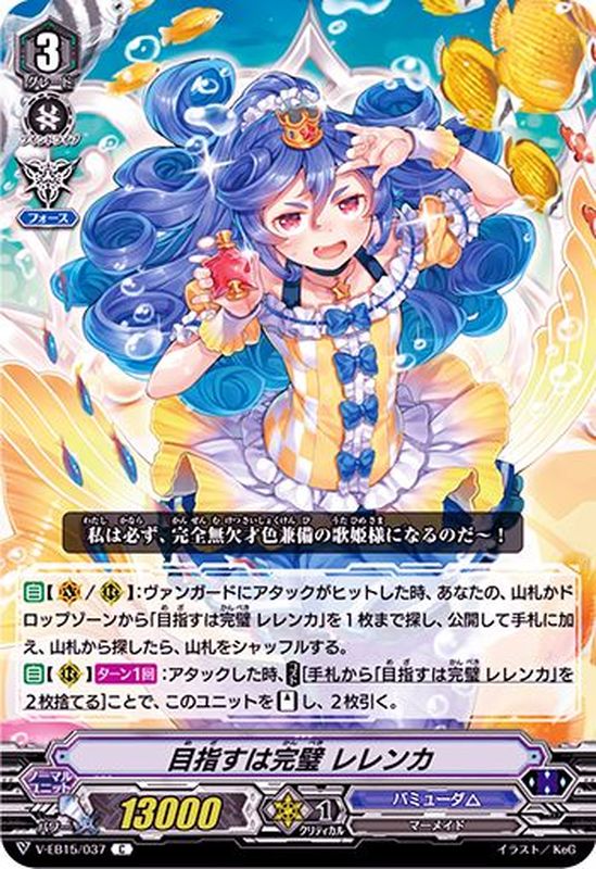 【自】【(V)/(R)】:ヴァンガードにアタックがヒットした時、あなたの、山札かドロップゾーンから「目指すは完璧 レレンカ」を1枚まで探し、公開して手札に加え、山札から探したら、山札をシャッフルする。【自】【(R)】【ターン1回】:アタックした時、【コスト】[手札から「目指すは完璧 レレンカ」を2枚捨てる]ことで、このユニットを【スタンド】し、2枚引く。