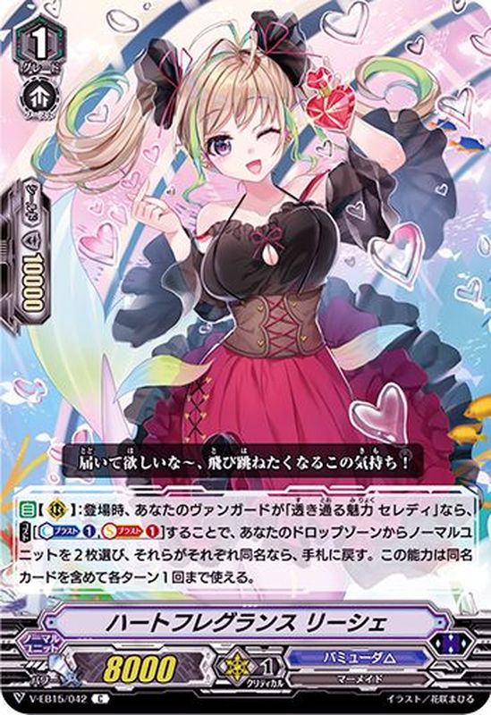 【自】【(R)】:登場時、あなたのヴァンガードが「透き通る魅力 セレディ」なら、【コスト】[【カウンターブラスト】(1),【ソウルブラスト】(1)]することで、あなたのドロップゾーンからノーマルユニットを2枚選び、それらがそれぞれ同名なら、手札に戻す。この能力は同名カードを含めて各ターン1回まで使える。