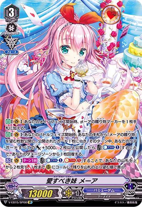 【自】【(V)】:あなたのメインフェイズ開始時、メーアの贈り物マーカーを1枚手札に加える。【自】【(V)】:あなたのバトルフェイズ開始時、あなたの手札から「メーアの贈り物」を望む枚数公開し、公開されたカード1枚につき、そのターン中、あなたのリアガードすべてのパワー+5000。2枚以上公開したら、【コスト】[【カウンターブラスト】(1)]することで、あなたのダメージゾーンから1枚回復する。【起】【(V)】【ターン1回】:【コスト】[【カウンターブラスト】(1),【ソウルブラスト】(1)]することで、あなたの山札を上から2枚見て、1枚まで(R)にコールし、残りを山札の上に望む順で置く。