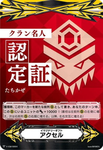 獲得時、このマーカーを新たな前列(R)として置き、あなたのターン中、この(R)にいるユニットのパワー+10000!(最初は左前列(R)の左側に増え、次は右前列(R)の右側に増える。以降、左右交互に増える)