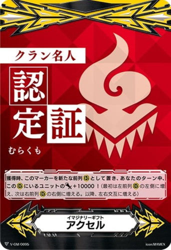 獲得時、このマーカーを新たな前列(R)として置き、あなたのターン中、この(R)にいるユニットのパワー+10000!(最初は左前列(R)の左側に増え、次は右前列(R)の右側に増える。以降、左右交互に増える)