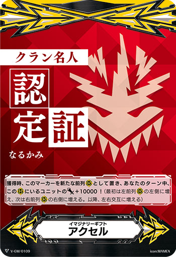 獲得時、このマーカーを新たな前列(R)として置き、あなたのターン中、この(R)にいるユニットのパワー+10000!(最初は左前列(R)の左側に増え、次は右前列(R)の右側に増える。以降、左右交互に増える)