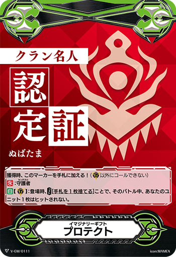 獲得時、このマーカーを手札に加える!((G)以外にコールできない)【永】:守護者【自】【(G)】:登場時、【コスト】[手札を1枚捨てる]ことで、そのバトル中、あなたのユニット1枚はヒットされない。