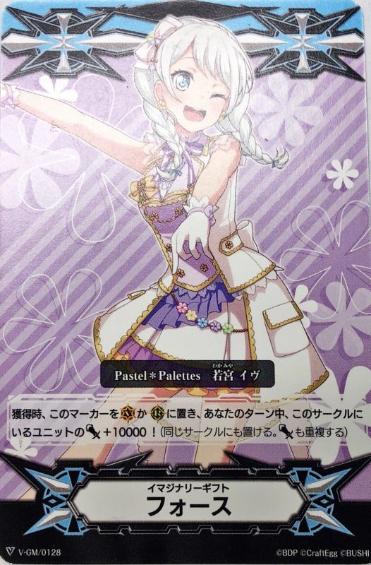 獲得時、このマーカーを(V)か(R)に置き、あなたのターン中、このサークルにいるユニットのパワー+10000!(同じサークルにも置ける。パワーも重複する)