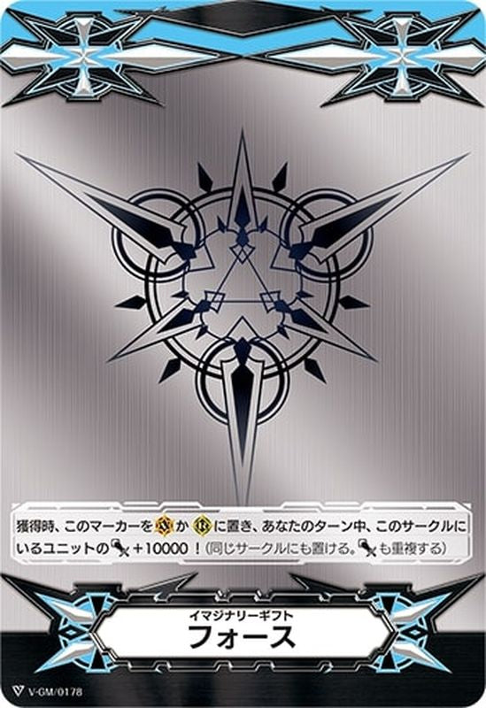 獲得時、このマーカーを(V)か(R)に置き、あなたのターン中、このサークルにいるユニットのパワー+10000!(同じサークルにも置ける。パワーも重複する)
