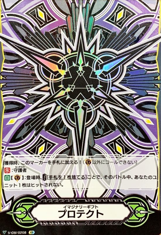 獲得時、このマーカーを手札に加える!((G)以外にコールできない)【永】:守護者【自】【(G)】:登場時、【コスト】[手札を1枚捨てる]ことで、そのバトル中、あなたのユニット1枚はヒットされない。