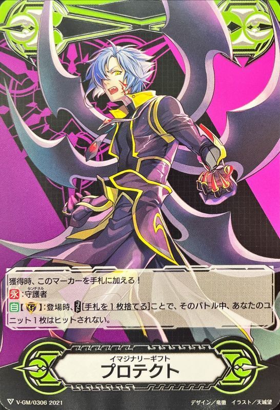 獲得時、このマーカーを手札に加える!【永】:守護者【自】【(G)】:登場時、【コスト】[手札を1枚捨てる]ことで、そのバトル中、あなたのユニット1枚はヒットされない。
