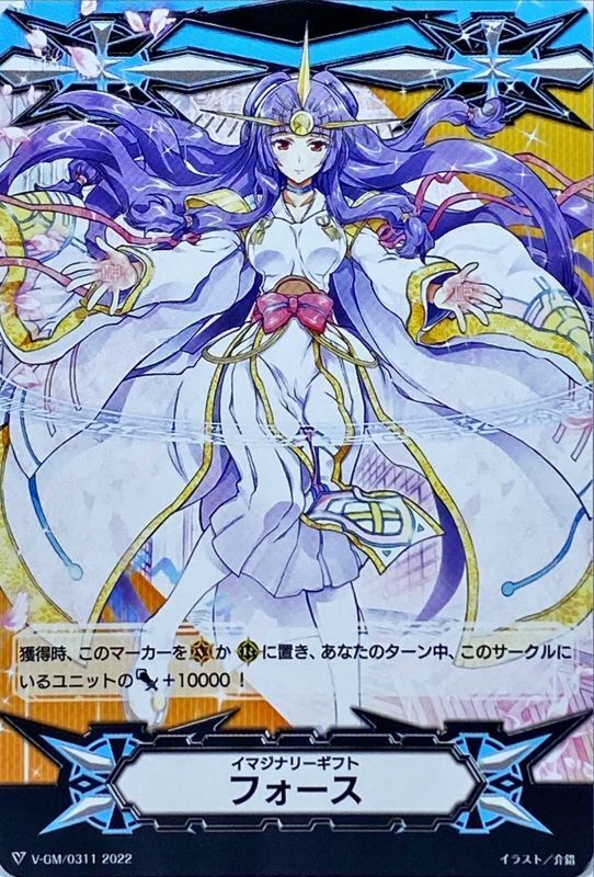 獲得時、このマーカーを(V)か(R)に置き、あなたのターン中、このサークルにいるユニットのパワー+10000!