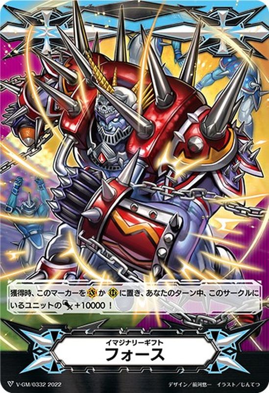 獲得時、このマーカーを(V)か(R)に置き、あなたのターン中、このサークルにいるユニットのパワー+10000!